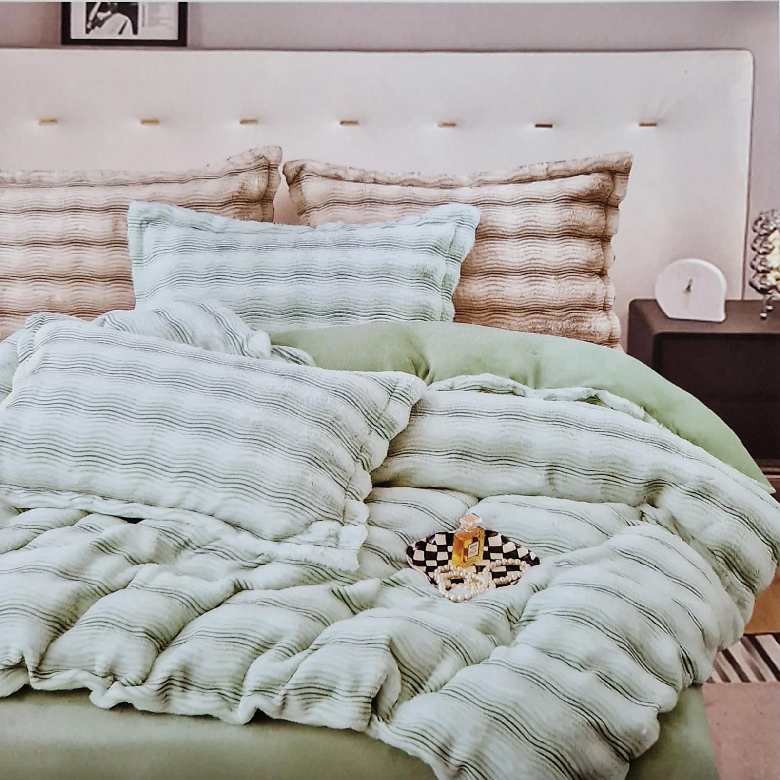 Set elegant și călduros, realizat din microfibră plușată premium, cu textură „blană de iepure” și model Waves. Materialul moale și catifelat păstrează căldura, dar permite pielii să respire — ideal pentru sezonul rece și potrivit pentru un dormitor modern.