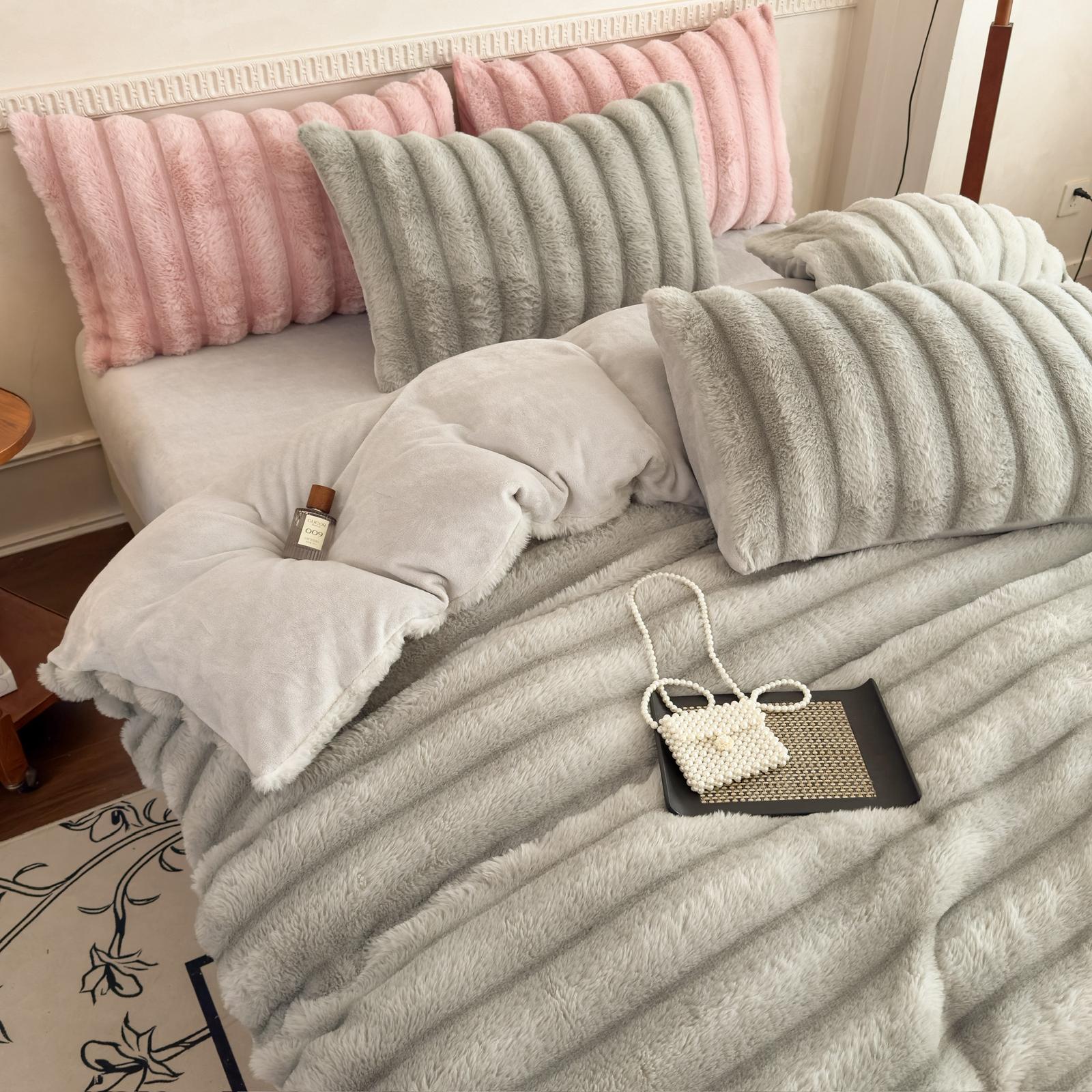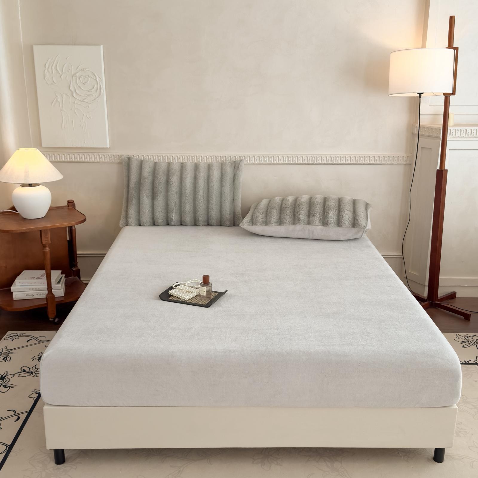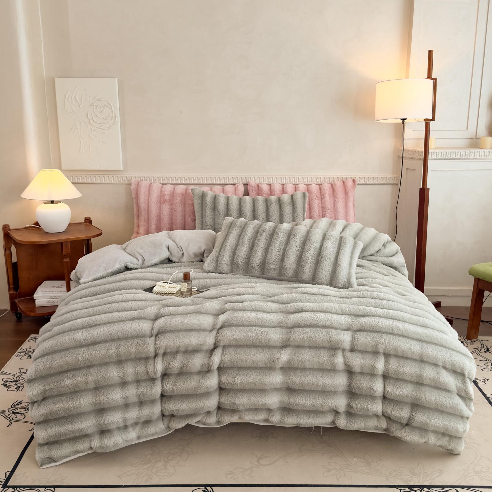 Set elegant și călduros, realizat din microfibră plușată premium, cu textură „blană de iepure” și model Waves. Materialul moale și catifelat păstrează căldura, dar permite pielii să respire — ideal pentru sezonul rece și potrivit pentru un dormitor modern.