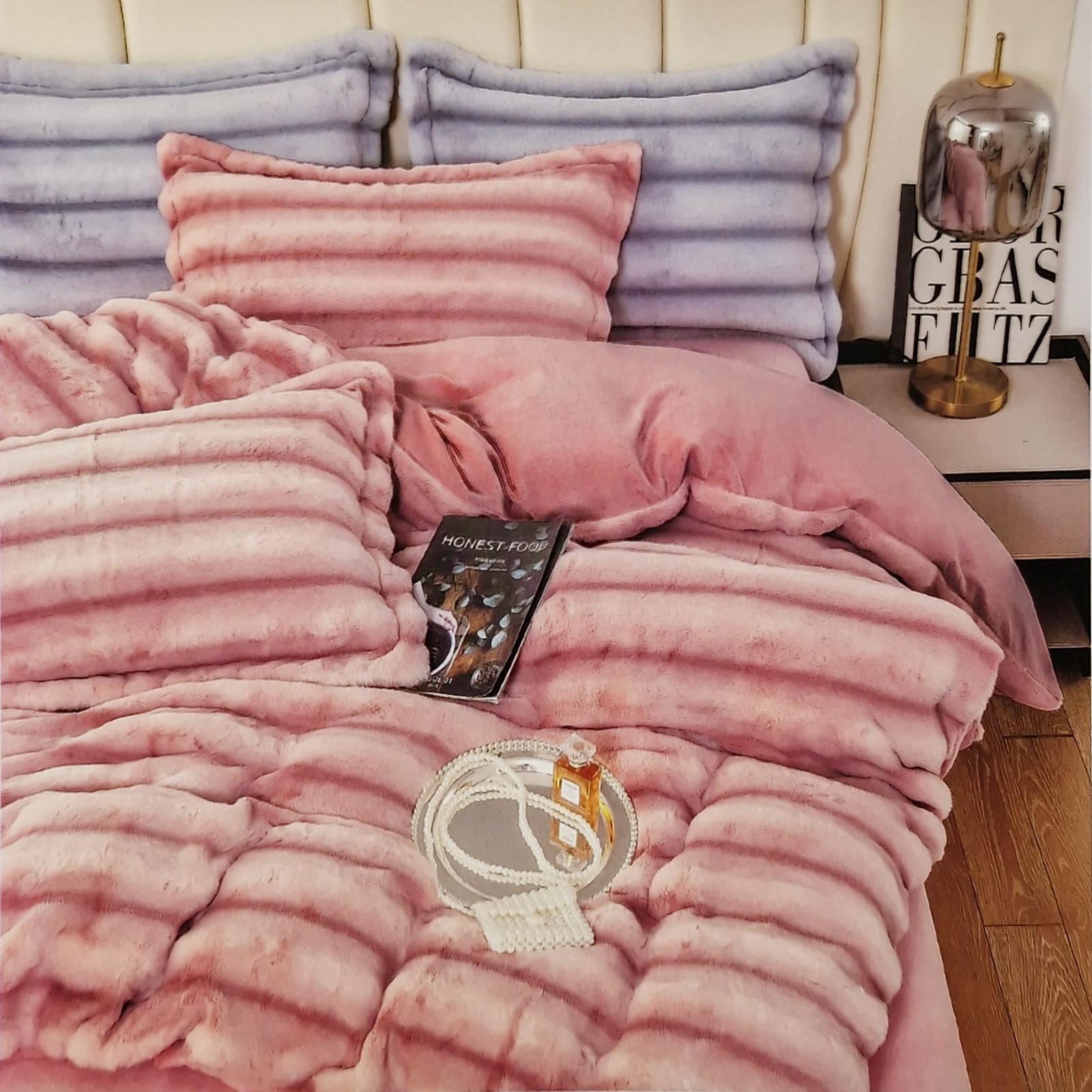 Set elegant și călduros, realizat din microfibră plușată premium, cu textură „blană de iepure” și model Waves. Materialul moale și catifelat păstrează căldura, dar permite pielii să respire — ideal pentru sezonul rece și potrivit pentru un dormitor modern.