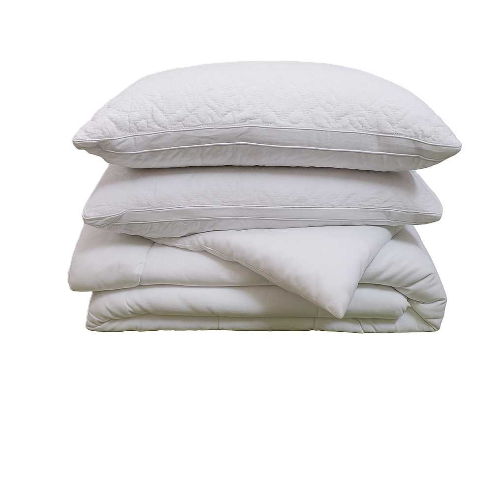 SETUL CONȚINE: O PILOTĂ 200X220CM CU GREUTATE 2350G ȘI DOUĂ PERNE 50X70 CM, MATLASATE, 880G FIECARE, MATERIAL MICROFIBRĂ UMPLUT CU MELANĂ.